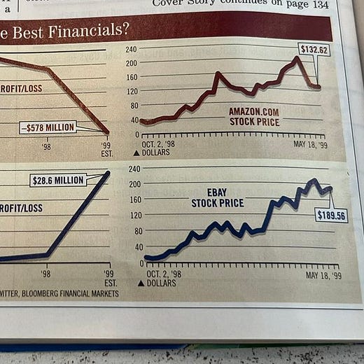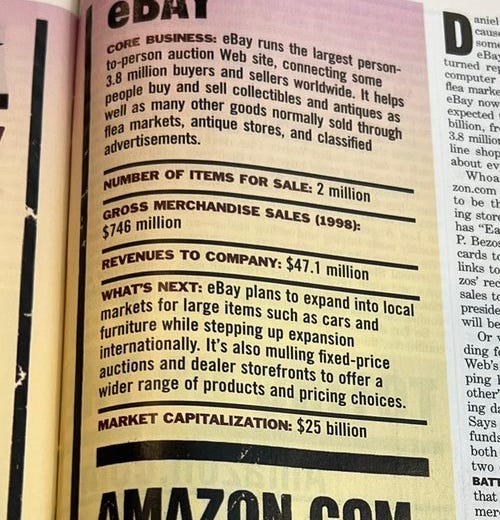 Hace 23 años en este periódico comparaban Amazon vs. eBay. Más allá de que el crecimiento de cada una, por aquel entonces “empatadas”, ha sido muy distinto, es interesante ver cómo explicaban lo que era Amazon. Es interesante por entender que tratar de intuir lo que hay por detrás de disrupciones tan fuertes es difícil. Razón por la cual innovar muchas veces es “dejar hacer” sin en ocasiones tener claro el propósito o el horizonte al que se llegará. Menos utilitarismo, más exploración.